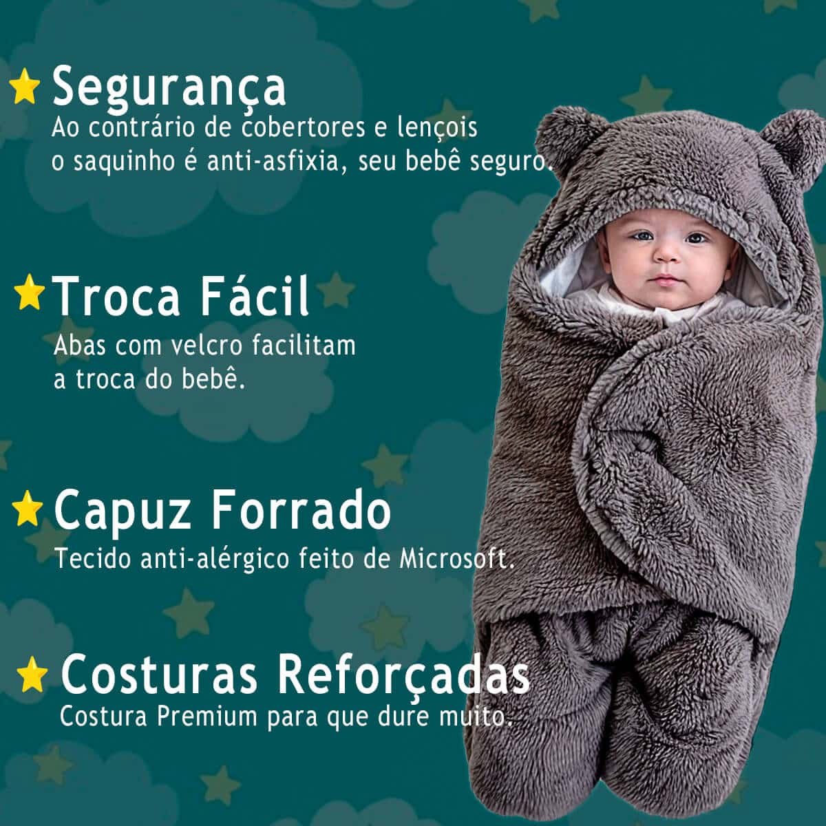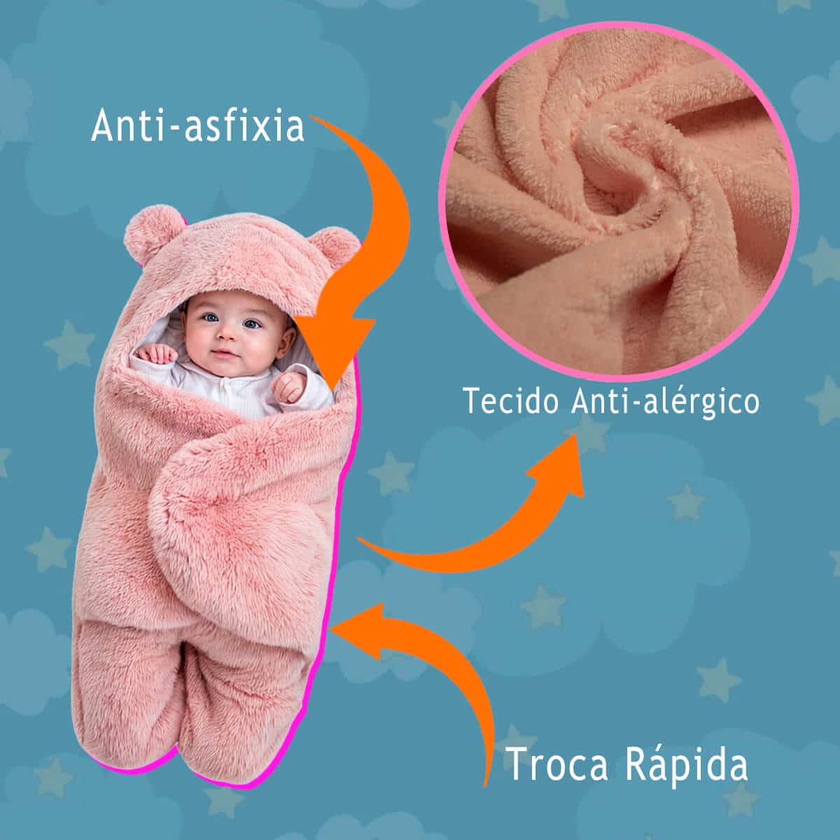 Diferente dos modelos comuns (grossos e ásperos), o nosso possui pelúcia fofinha e fininha, que mantém o bebê aquecido sem irritar a pele.